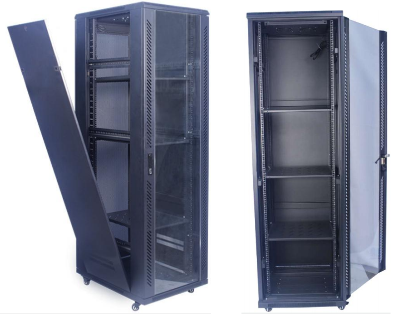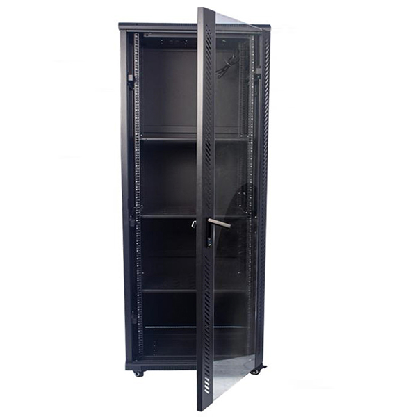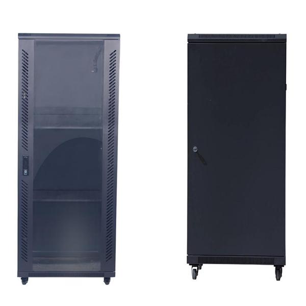 前門鋼化玻璃門(5mm 厚玻璃),后門鐵板門, 側門塑料卡扣,可快速拆卸,也可加小圓鎖 可關閉的上部,下部多處走線通道,底部走線孔尺寸可按需調整 可同時安裝腳輪和支撐腳;